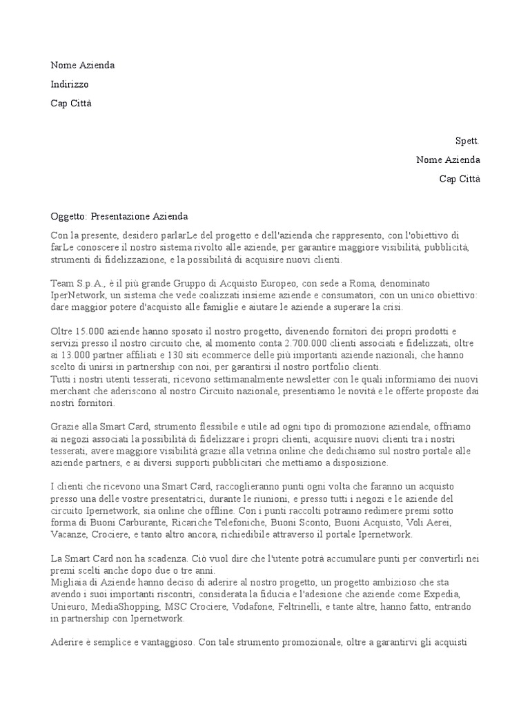 Modello lettera di presentazione: esempio e consigli - Indeed La prima sezione della tua lettera di presentazione deve contenere le tue informazioni di contatto e, possibilmente, anche quelle dell'azienda alla quale ti stai candidando: Il tuo nome completo Il tuo indirizzo email Il tuo numero telefonico Il tuo indirizzo di residenza Data Nome del datore di lavoro Titolo Azienda Contatti Come scrivere una lettera di presentazione aziendale? Modello di lettera di presentazione aziendale. Analizziamo ora, passaggio dopo passaggio, come scrivere una lettera di presentazione aziendale efficace e corretta: Un buon modo per iniziare la tua mail è: Gentile [cognome del potenziale cliente]. L'incipit dovrà essere formale, in quanto ancora non conoscete il vostro interlocutore.
