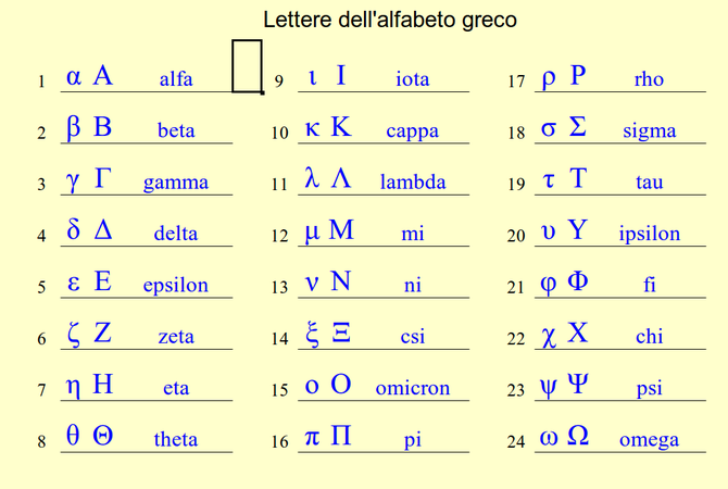Qual è la sesta lettera greca? Qual è la sesta lettera dell'alfabeto greco? Sinonimi, cruciverba e altre parole correlate per SESTA LETTERA DELL'ALFABETO GRECO [zeta] Qual è la quinta lettera greca? ... In quanto tale, omega non è l'ultima lettera dell'alfabeto greco perché rappresenta il numero 800. Altre lettere spesso omesse sono digamma/F = (6) e koppa (simile a Q) = 90. L'IDEATORE DELL'ALFABETO SLAVO - Cruciverba Soluzioni Tutte le soluzioni dei cruciverba per L'IDEATORE DELL'ALFABETO SLAVO per le Cruciverba e parole crociate. Dizionario delle parole crociate. Sito web utile per ogni risolutore L ... La 21ª lettera dell'alfabeto greco; Quindicesima lettera dell'alfabeto greco; Una vocale dell'alfabeto greco;