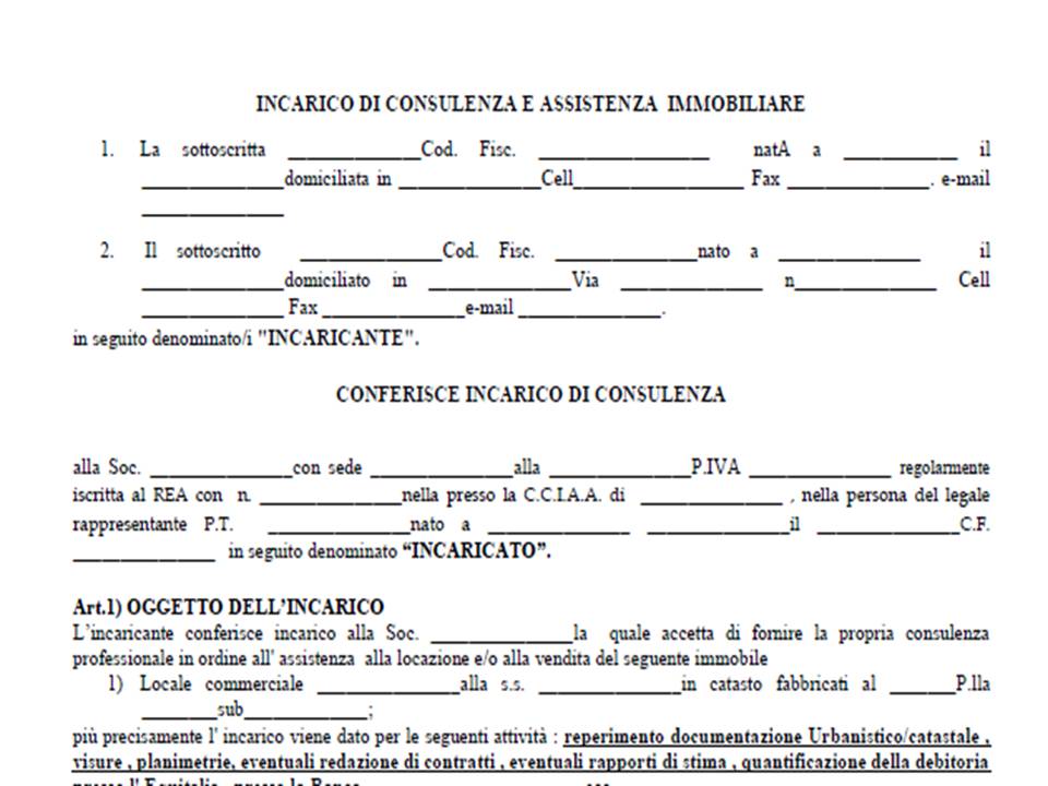 Come disdire il mandato di agenzia immobiliare e fac simile - HomeSell.it Modello fac simile per la revoca del mandato di agenzia immobiliare Abbiamo preparato un modello pronto da stampare per revocare l'incarico all'agenzia. Una volta stampato, compilalo nelle sue parti e invialo all'agenzia con raccomandata a/r. Ricordati che deve essere firmato da tutte le partiche fanno domanda. Fac simile incarico di mediazione immobiliare per la vendita Fac simile incarico di mediazione immobiliare per la vendita 02 February, 2021 INCARICO DI MEDIAZIONE PER VENDITA Il/i sottoscritto/i ……………… (di seguito denominato VENDITORE) nato a ……………… il ……………… documento d'identità ……………… C.F./P.I ……………… residente a ……………… in via ……………… n° ……………… tel ……………… in qualità di ……………… della ……………… conferisce incarico