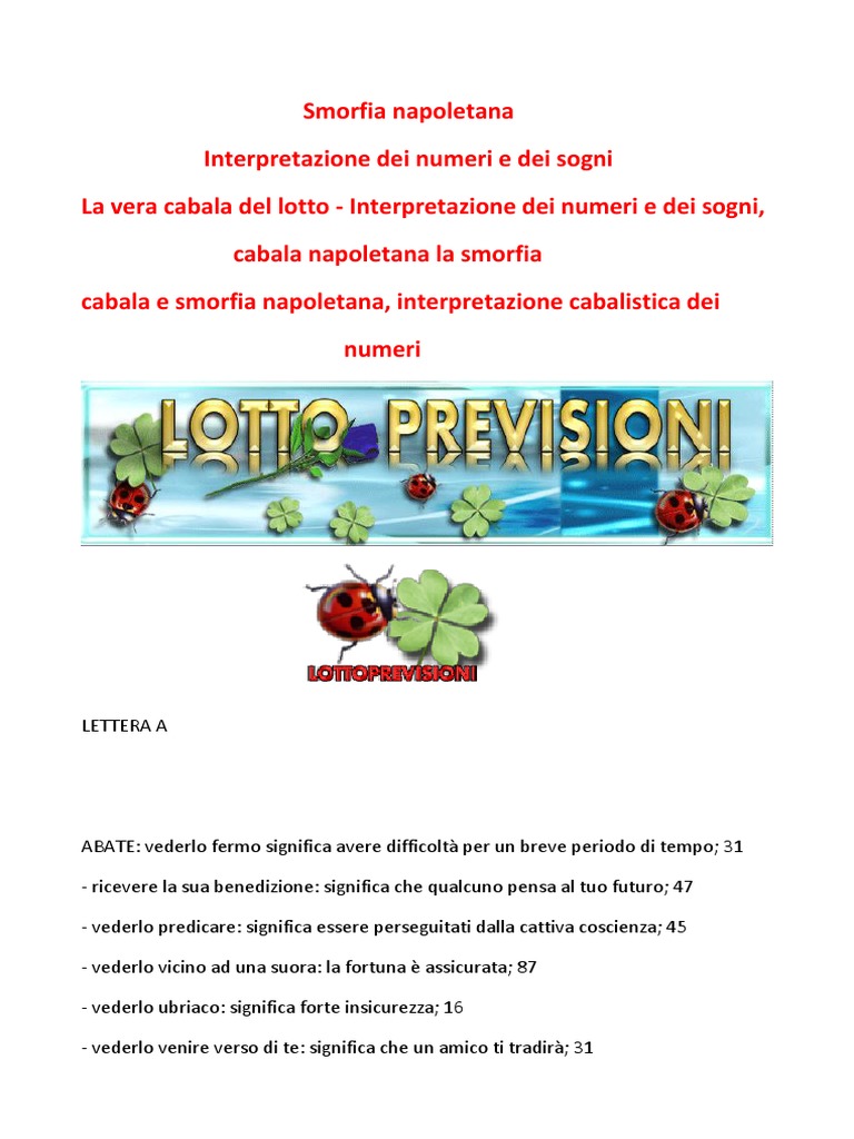 La smorfia napoletana A - NDONIO.IT Torna alla Smorfia. LETTERA A # Occorrenza: Situazione: Spiegazione: Numero da giocare: 1) abate: che sta benedicendo: prosperita certa: 74 : 2) abate: che sta officiando: si faranno sacrifici di cui si vedranno i frutti positivi ma dopo un certo tempo: 18 : 3) abate: in generale: presagio di sventura: 38 : 4)